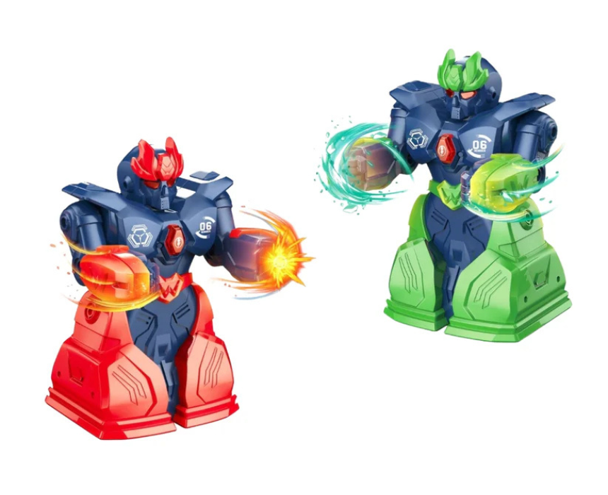This Fighting Robots set features two remote-controlled robots designed for action-packed battles, each with 5 lives where the last robot standing wins. The robots can move forward and reverse, punch with both hands, and activate lights and sound effects when their foreheads touch, creating an exciting interactive play experience. Style note: comfortably hold the controllers and play in an open area to allow smooth movement and full boxing action.