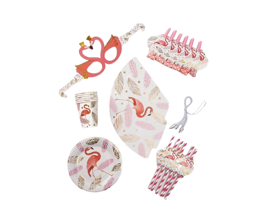 The Flamingo Paper Set is a fun and colorful party kit including 6 nine-inch plates, 6 cups, 6 straws, 6 blowers, 6 glasses, and 6 hats. Perfect for birthdays, summer parties, or themed celebrations, it makes table setup easy and stylish. Its vibrant flamingo design brings a festive and playful touch to any event.