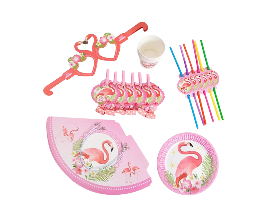 The Flamingo Paper Set is a complete party kit featuring 6 seven inch plates, 6 cups, 6 straws, 6 glasses, 6 blowers, and 6 hats. Perfect for birthdays, summer gatherings, or themed celebrations, it makes party setup simple and coordinated. Its fun flamingo design adds a bright and festive touch to any event.