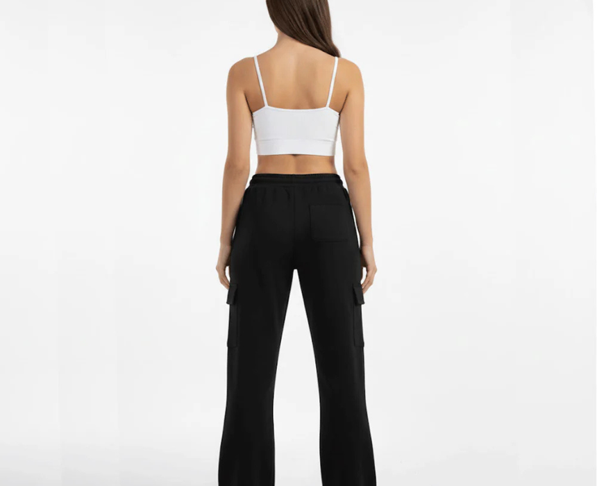 The flare yoga pants in black cotton for women feature a comfortable baggy fit with convenient pockets, perfect for yoga, lounging, or casual outings. Made from soft, breathable fabric, they provide ease of movement and style, easily paired with crop tops, tees, or athletic wear for a relaxed, versatile look.