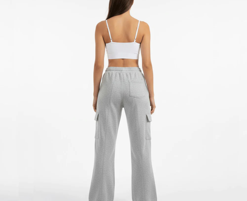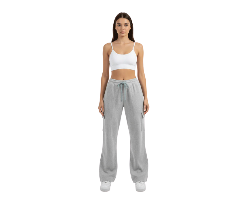 The flare yoga pants in grey cotton for women offer a comfortable baggy fit with handy pockets, ideal for yoga, lounging, or casual outings. Made from soft, breathable fabric, they allow ease of movement and style, easily paired with crop tops, tees, or sweatshirts for a relaxed, versatile look.