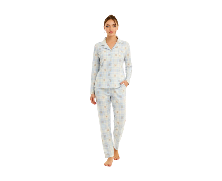 This baby blue fleece pajama set features a cozy, patterned design perfect for lounging or sleeping. Made from soft, warm fleece, it provides comfort and style for all-day relaxation. Ideal for casual wear at home or as a thoughtful gift, it combines practicality with a cute, charming look.