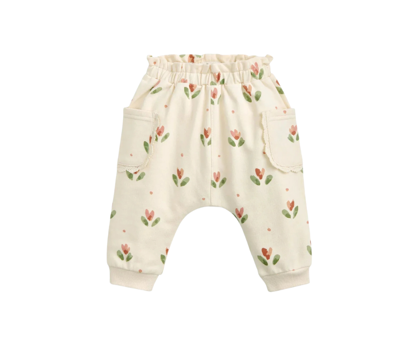 The Bloom Spot Joggers in floral print are soft, comfortable, and perfect for everyday wear for babies and toddlers. Featuring a paper bag waistband, ribbed cuffs, and patch pockets with crochet lace trim, they combine practicality with charming style. Pair them with a simple tee or knit top for a cute, relaxed look.</p
