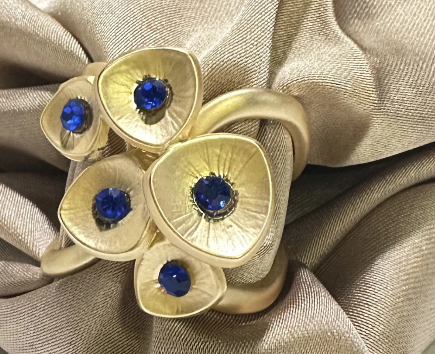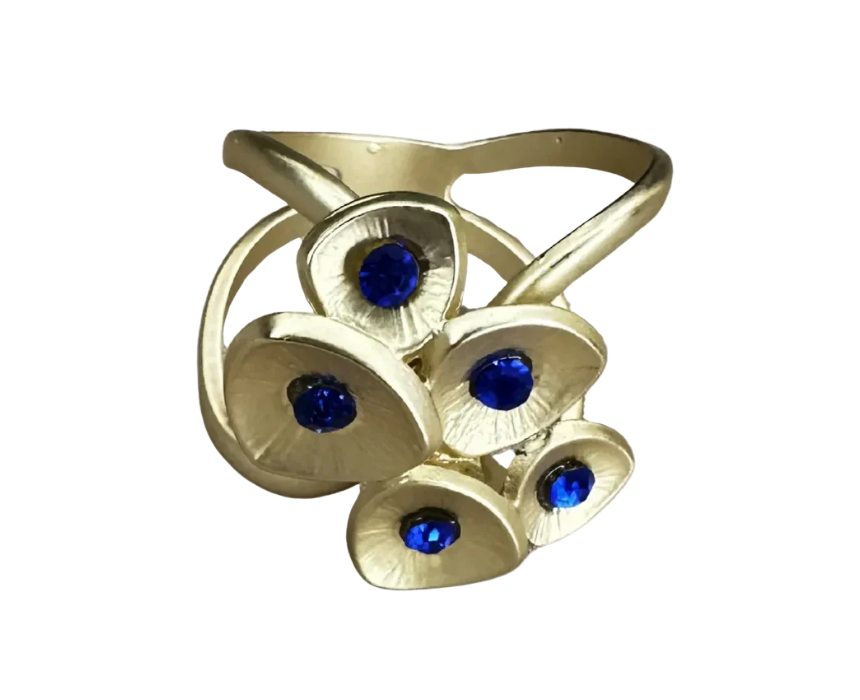 The Floral Cluster Scarf Buckle is a gold tone metal alloy accessory featuring a sculpted petal cluster adorned with deep blue crystal accents. Designed to secure your scarf with elegance, it adds a refined, feminine touch to both casual and formal outfits. Simply thread your scarf through the ring to create structured, polished drapes with a statement finish.