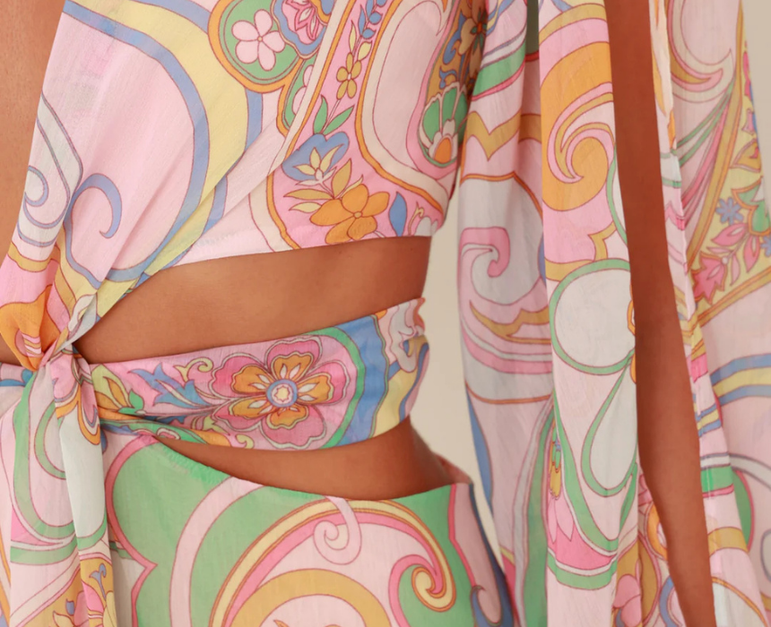The Floral Finesse Dress is a pastel maxi dress with a unique blind-waist cutout, offering a modern and elegant look. Perfect for daytime events or evening outings, pair it with strappy sandals or heels and minimal accessories for a chic, effortless style. Made from soft polyester, fabric care includes machine wash at 30°C, professional dry clean, medium-heat ironing, no bleaching, and do not tumble dry.