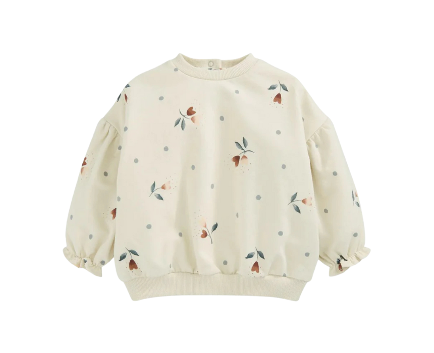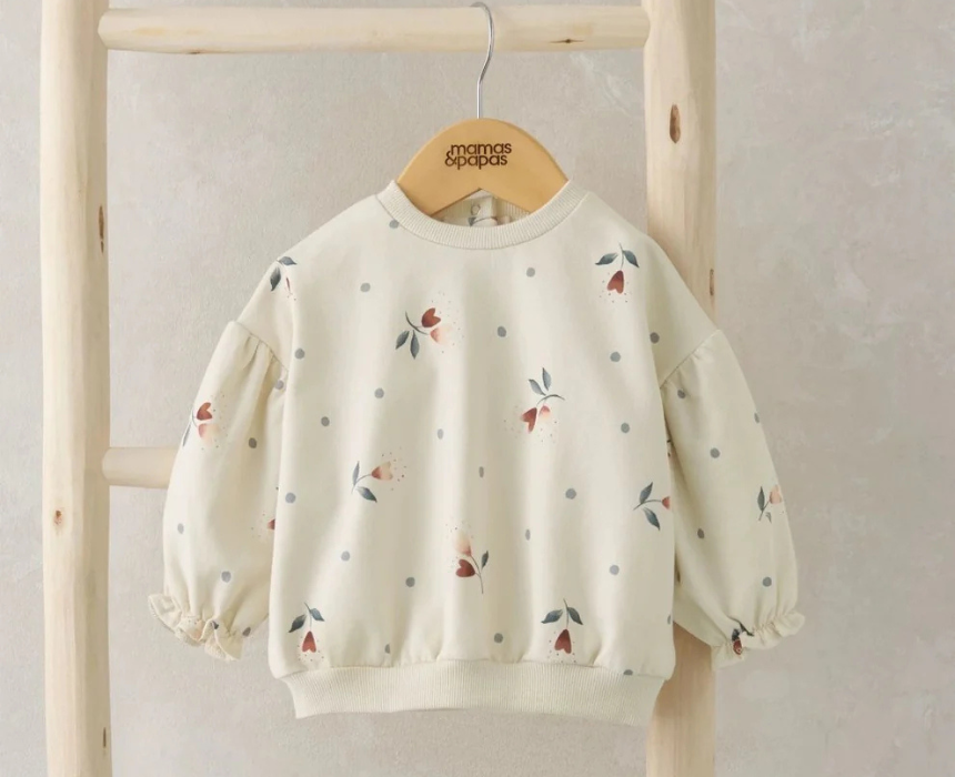 The Floral Heart Sweatshirt features a charming floral and heart print with stylish balloon-shaped sleeves, elasticated frill cuffs, and a ribbed hem for a comfortable fit. Designed as part of the Explore the World Baby and Toddler collection, it includes a concealed back neck popper fastening for easy dressing. Perfect for everyday wear, it pairs effortlessly with leggings, joggers, or skirts for a cute, coordinated outfit.