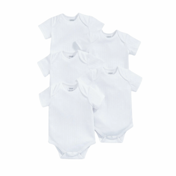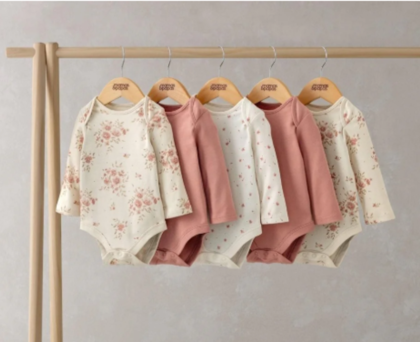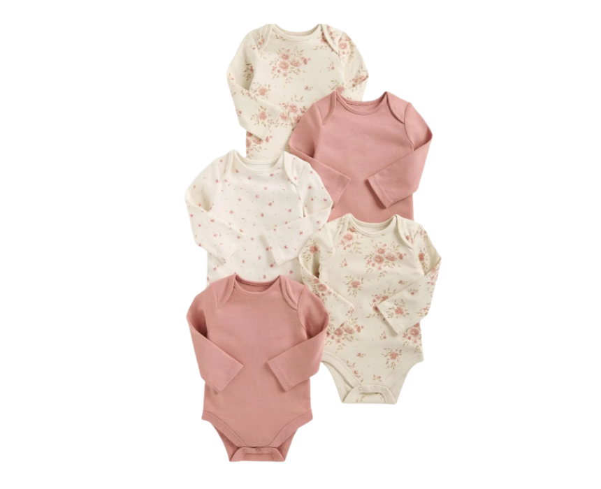 The Floral Long Sleeve Bodysuits Pack of 5 includes soft, breathable 100% cotton essentials designed for all-day comfort. Featuring a watercolour floral theme with a mix of watercolour floral prints, ditsy floral, and plain dusted peony styles, this handy set is perfect for everyday layering or wearing on its own. Easy to style under outfits or paired with leggings or joggers for a cozy, practical look.