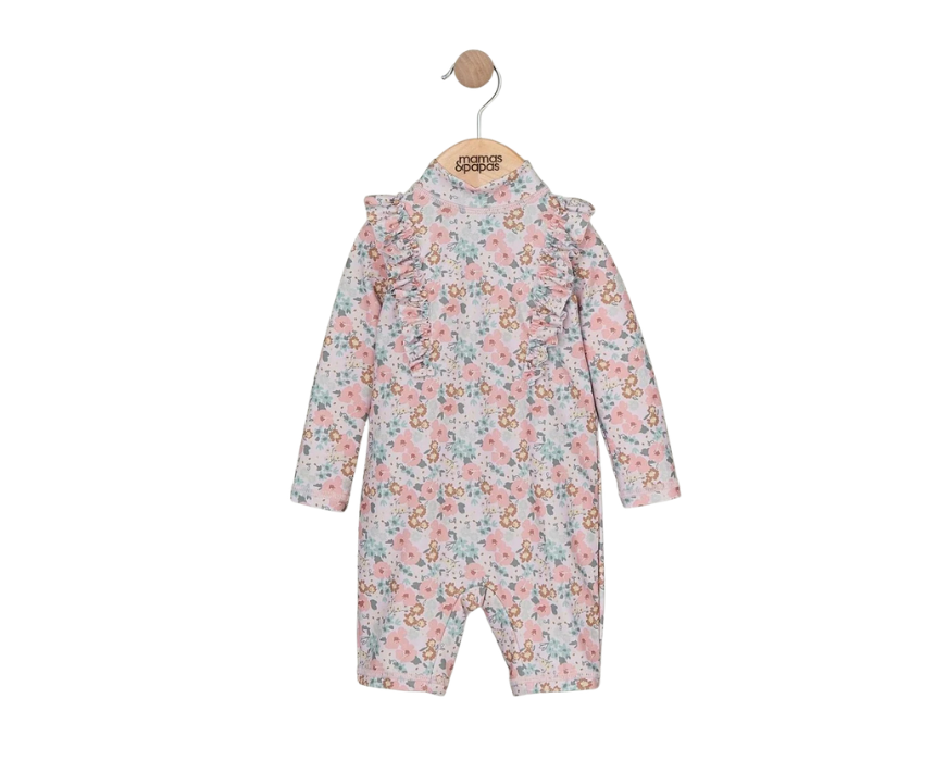 Floral short sleeve rashsuit designed for comfort and style, featuring a cute blooms print, back zip fastening for easy changing, and delicate ruffle shoulder details. Made from a stretchy, quick drying fabric with a soft lining, it is ideal for pool or beach days and all day wear. Pair with a sun hat or sandals for a fun, practical summer look.