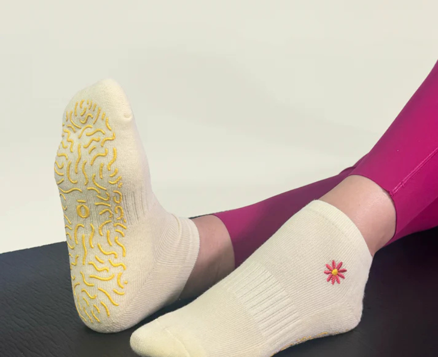 Flower Girl features a delicate floral design with supportive grip soles for comfort and stability. Ideal for lounging, yoga, or casual wear, this cheerful pair adds a soft, feminine touch to cozy loungewear and everyday outfits.