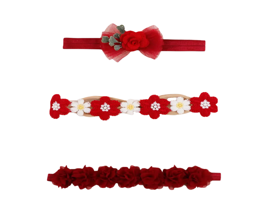 The Flower Headbands 3-Pack in red brighten up any baby outfit, featuring soft, stretchy bands with delicate flower details. Gentle on infant skin and comfortable for all-day wear, they are perfect for photoshoots, parties, holidays, or everyday style. Ideal for pairing with dresses, rompers, or casual outfits, they add a charming and playful finishing touch.