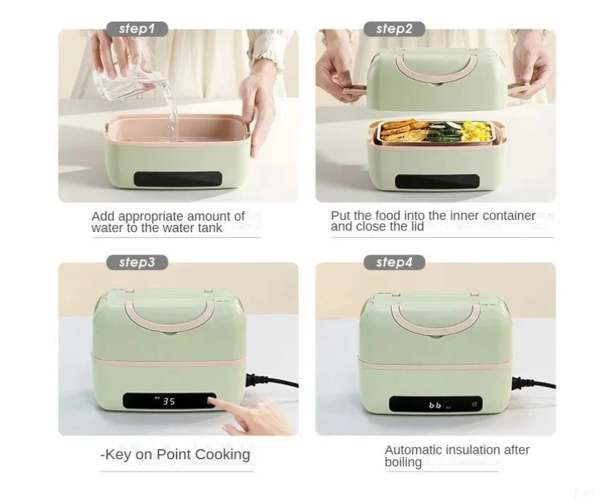 The Portable Electric Lunch Box is a compact and lightweight solution for on the go meals without the need for a microwave. It has dual power options a two layer stainless steel liner for even heating a water injection heating system for quick and evenly cooked meals and a nine and a half hour timer for precise meal preparation. Perfect for office workers travelers or anyone who wants convenient hot meals anytime anywhere.