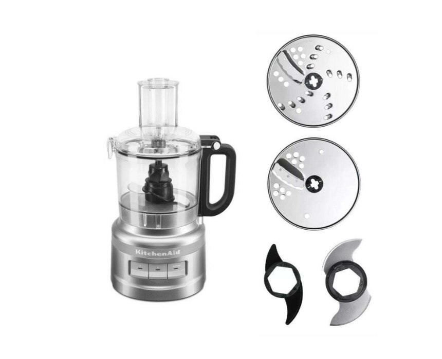 The KitchenAid 5KFP0719EER Food Processor features a 1.7 L work bowl and a 240W motor, perfect for chopping, mixing, shredding, slicing, and kneading dough. It includes a stainless steel multi-purpose blade, dough blade, adjustable slicing disc, and medium shredding disc, with two speeds plus pulse for precise control. Compact and stylish in vibrant red, it has user-friendly controls, a wide feed tube, secure bowl locking, and dishwasher-safe parts for easy, everyday kitchen use.