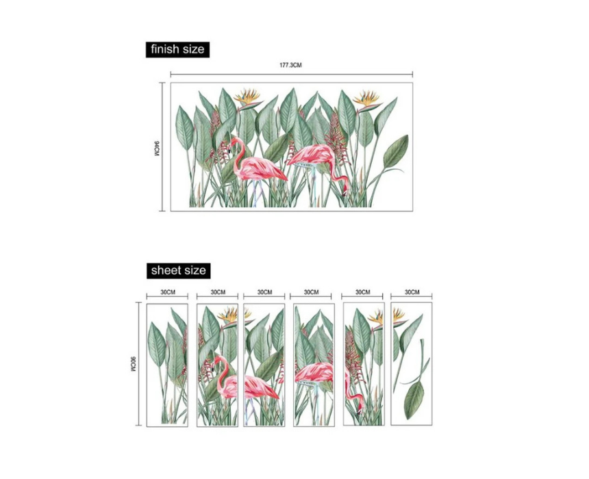 This Forest with Flamingo Wall Sticker features lush greenery, pink and yellow flowers, and exotic flamingos, adding vibrant and tropical vibes to any space. Measuring 94cm high and 177cm wide, it’s perfect for home, office, or shop décor. Easy to apply, it transforms walls into a lively and stylish focal point.