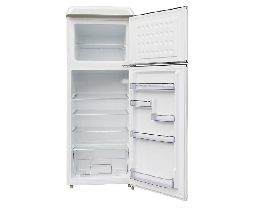 The FR300VR is a 2-door vintage retro refrigerator with a freezer compartment, mechanical controls, and manual defrosting for practical use. Its bold red color and retro metal handle add a nostalgic touch, making it a stylish focal point in any kitchen while offering ample storage and modern convenience.