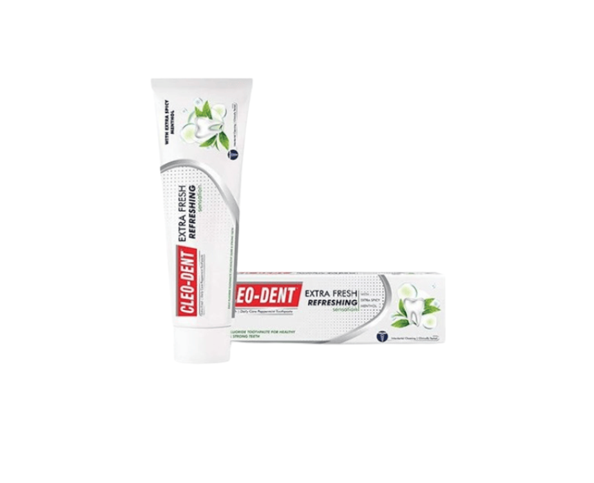 Cleo‑Dent Extra Fresh Toothpaste delivers long‑lasting freshness while protecting teeth and gums. Enriched with fluoride, it helps prevent cavities, reduce plaque buildup, and promote overall oral hygiene. Its cooling menthol formula leaves the mouth clean and refreshed, making it ideal for daily use to maintain a bright smile and healthy gums.