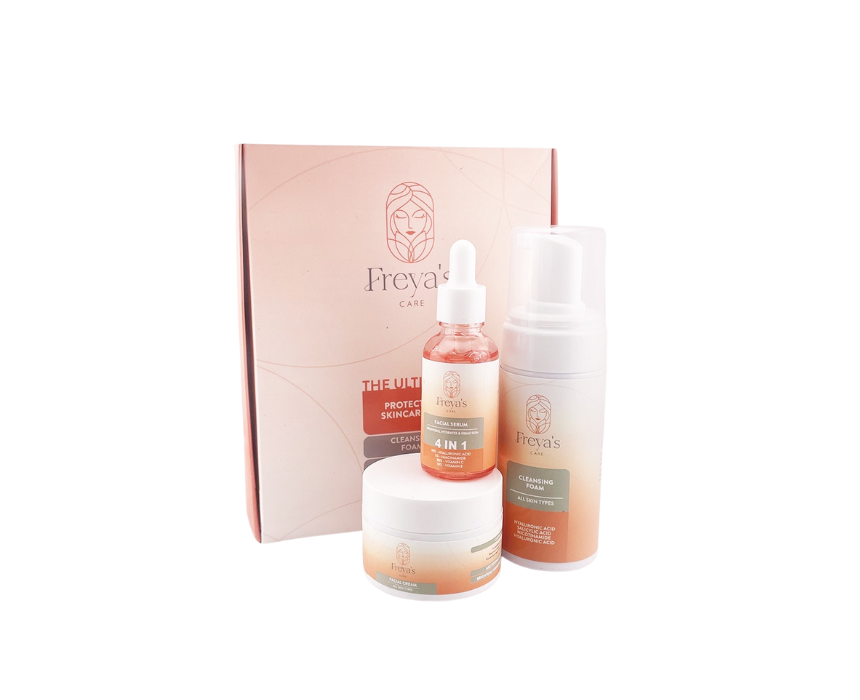 Freya’s Skincare Kit includes a 120ml Cleansing Foam, 30ml 4 IN 1 Serum, and 50ml 4 IN 1 Facial Cream to deliver complete daily skincare. The kit deeply hydrates, nourishes, protects, and rejuvenates the skin, promoting a youthful and radiant complexion. For best results, cleanse with the foam, apply the serum evenly, and finish with the facial cream morning and night.