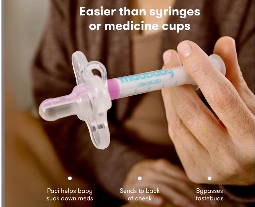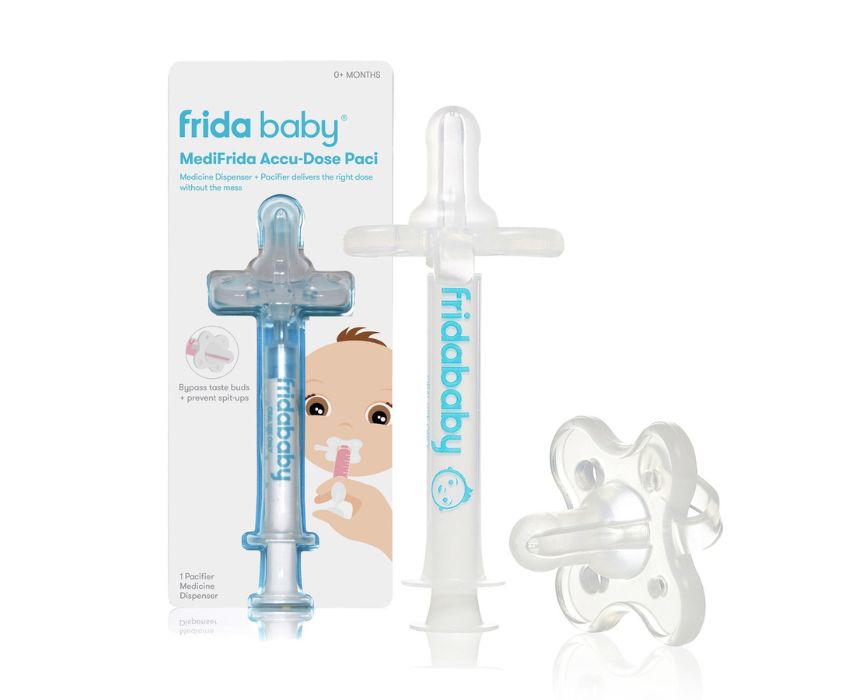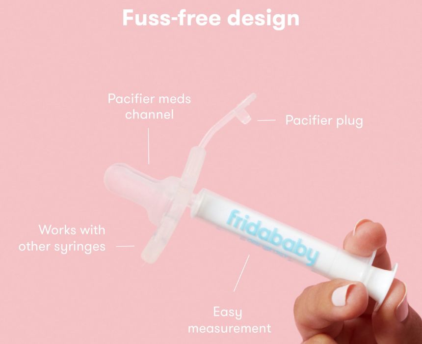 The Frida Dose Pacifier is a smart, mess-free baby medicine dispenser that delivers liquids to the side of the cheek to reduce spit-ups. With an included syringe marked for common doses, it ensures accurate medication, vitamin, or gripe water delivery. Designed in a hospital-trusted pacifier shape, it offers comfort and familiarity while doubling as a regular pacifier.