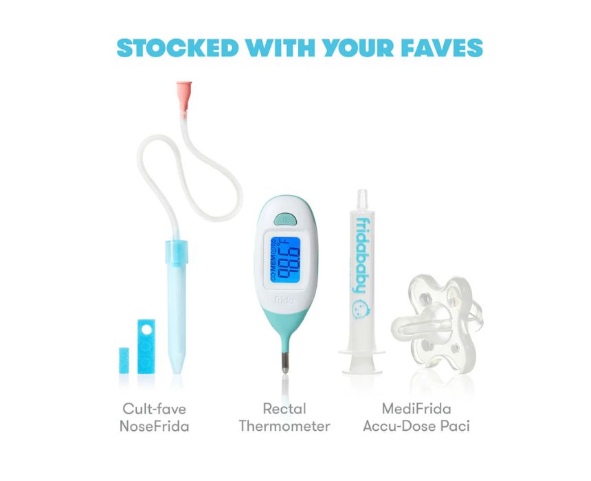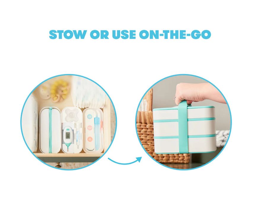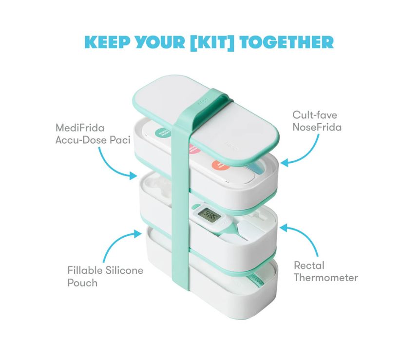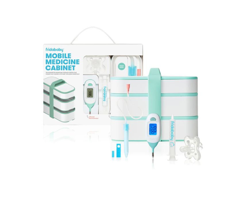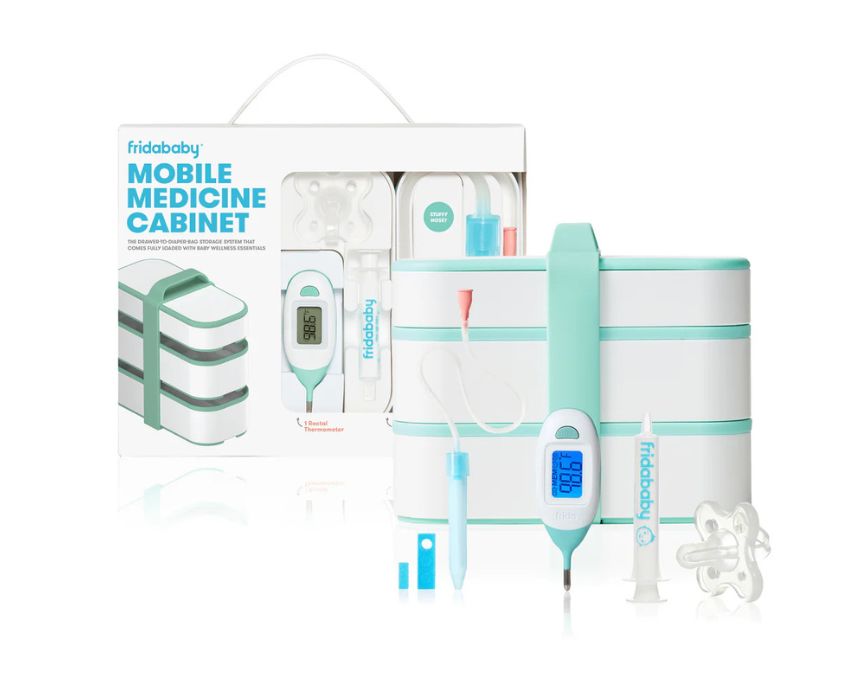 The Frida Mobile Medicine Cabinet is a versatile storage system designed for easy access to baby essentials both at home and on the go. It features separate layers for nursery drawers and a stackable, strap-secured design for travel. Packed with a NoseFrida nasal aspirator with filters, MediFrida pacifier medicine dispenser, rectal thermometer with quick 10-second readings, and a removable silicone pouch, it keeps all cold and flu necessities organized and mess-free wherever you are.