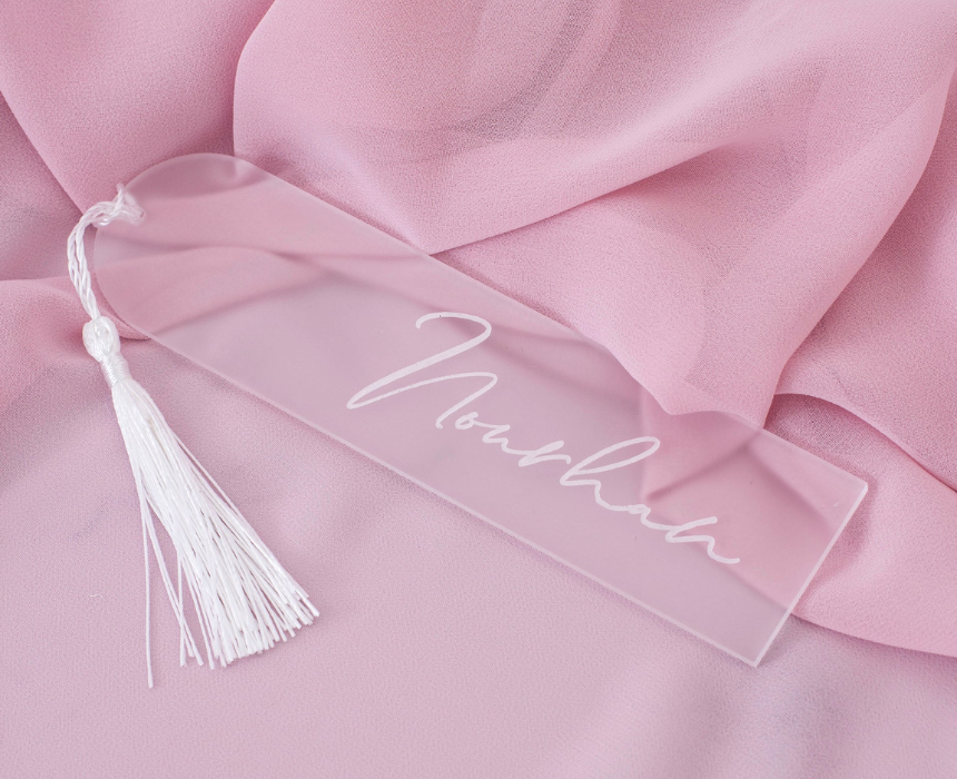 The Frosted Acrylic Bookmark offers a sophisticated and modern way to keep your place while adding a customized touch with a personalized name. This elegant 15 by 3.8 cm marker features a soft matte finish and a coordinating tassel, providing a durable yet stylish accessory for any book lover. To style this translucent piece, pair it with a pastel colored journal or a floral hardback and let the tassel hang over the edge to create a soft, minimalist aesthetic that looks beautiful on any nightstand or bookshelf.