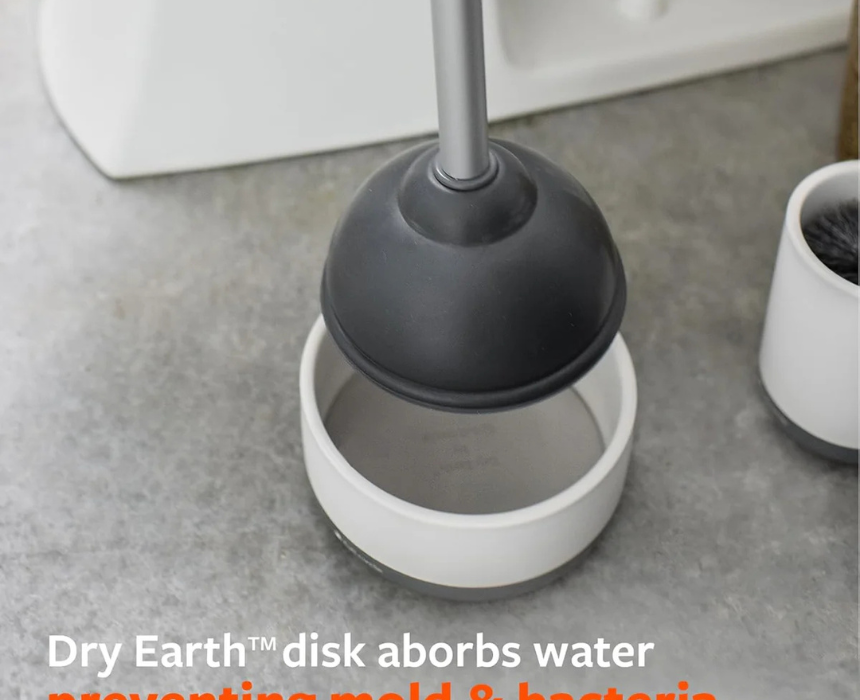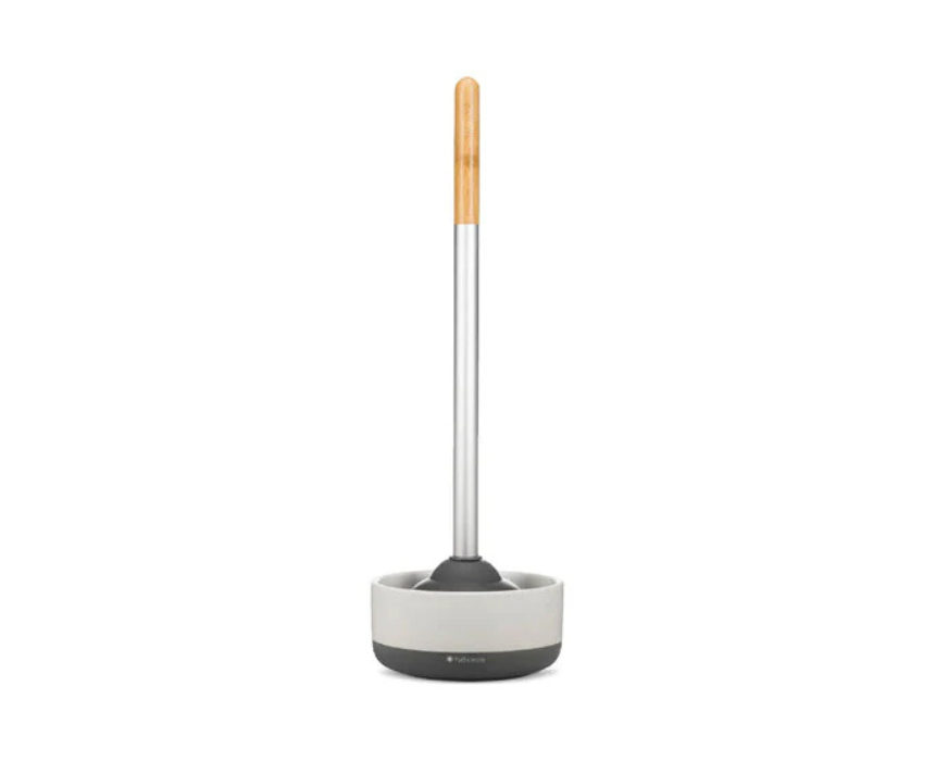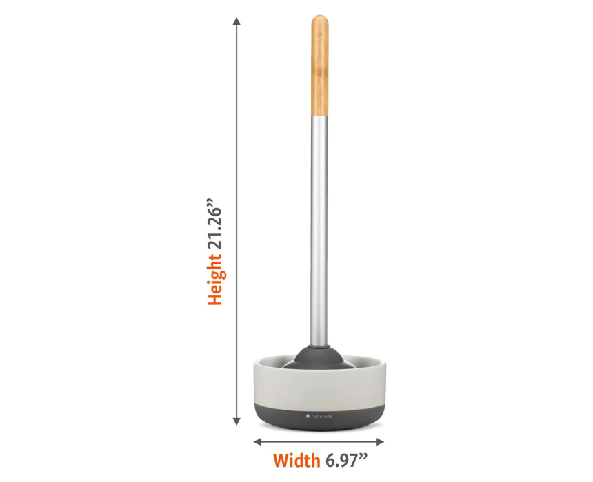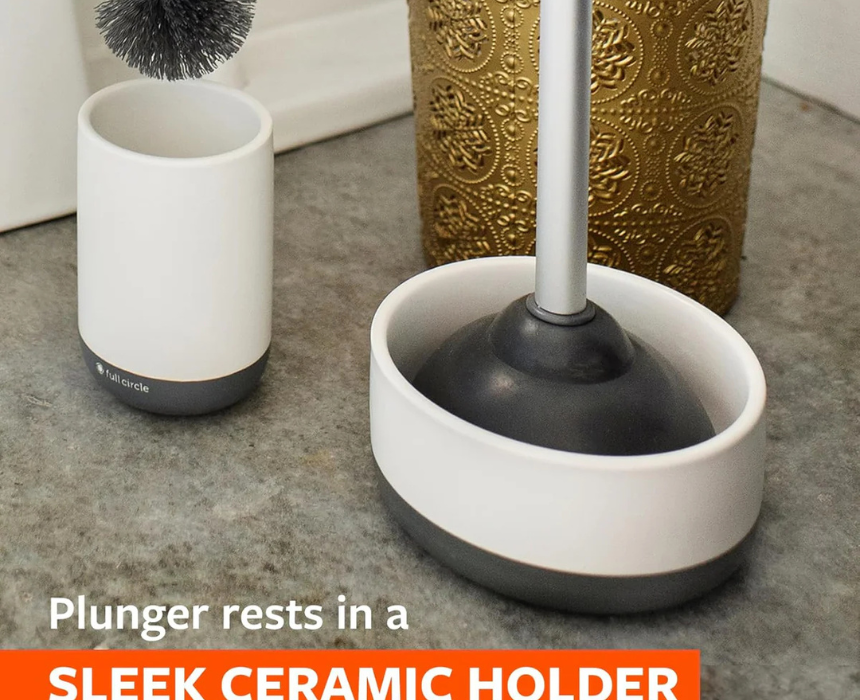 The Full Circle Royal Plunge Toilet Plunger features a durable diatomaceous rubber cup and comes with an elegant ceramic holder for hygienic storage. Designed for powerful plunging action, it efficiently clears clogs while keeping bathrooms tidy and stylish. For best results, it is styled by placing the plunger in the holder after use and applying steady pressure on the toilet drain for quick and effective unclogging.