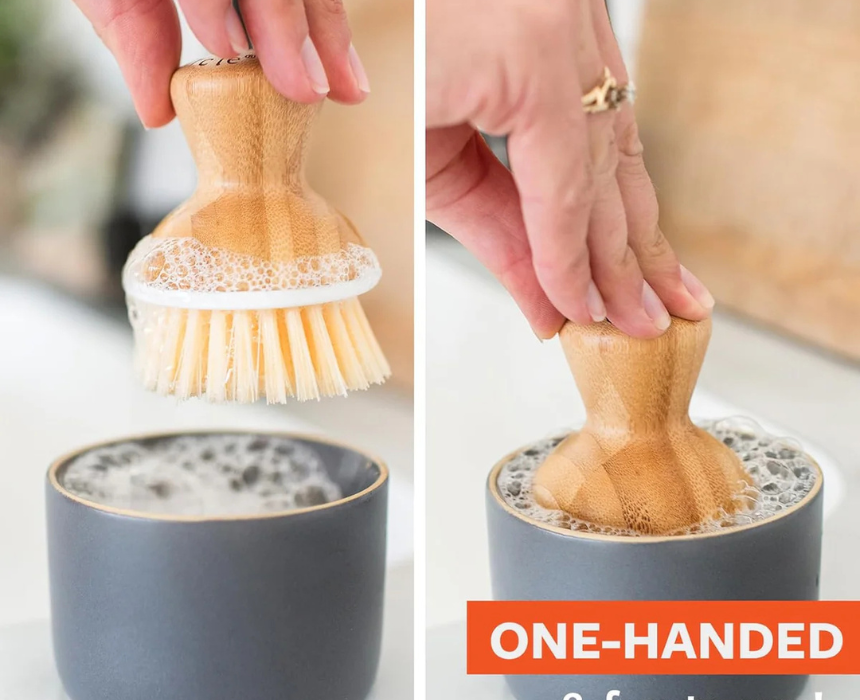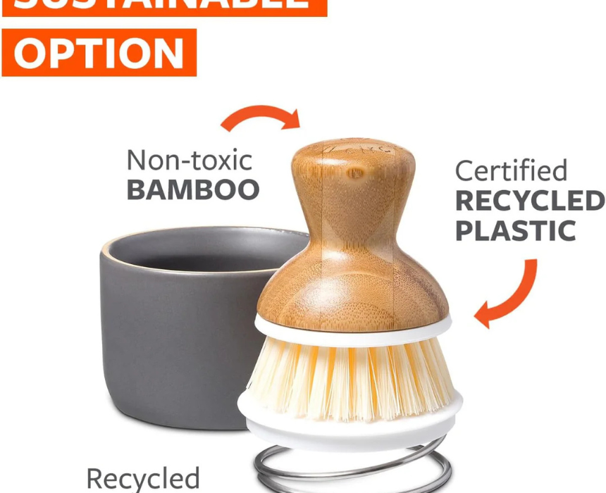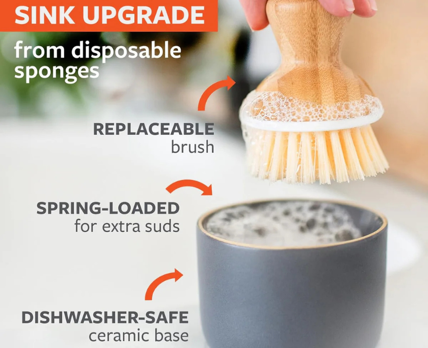 The Full Circle Soap Holder with Dish Brush is a beige, eco-friendly kitchen tool designed to keep dish soap and scrubbing essentials organized at the sink. This compact holder includes a coordinating dish brush for everyday cleaning while maintaining a tidy countertop. Style it by placing it next to the sink or on the counter to complement a neutral, minimalist eco kitchen setup.