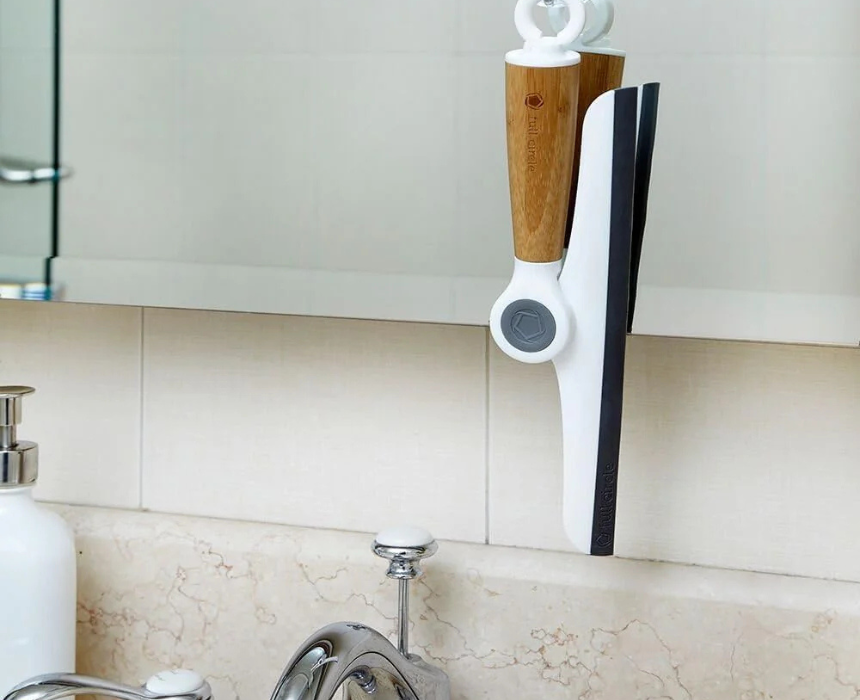The Full Circle Wipe Out Pivoting Shower Squeegee in white features a pivoting head for effortless water removal on glass, tiles, and mirrors, helping prevent water spots and soap scum. The included hanging hook allows convenient storage within easy reach. For best results, it is styled by placing the hook on a shower rail or wall, then pivoting the squeegee across surfaces after each use to maintain a clean, streak-free finish.