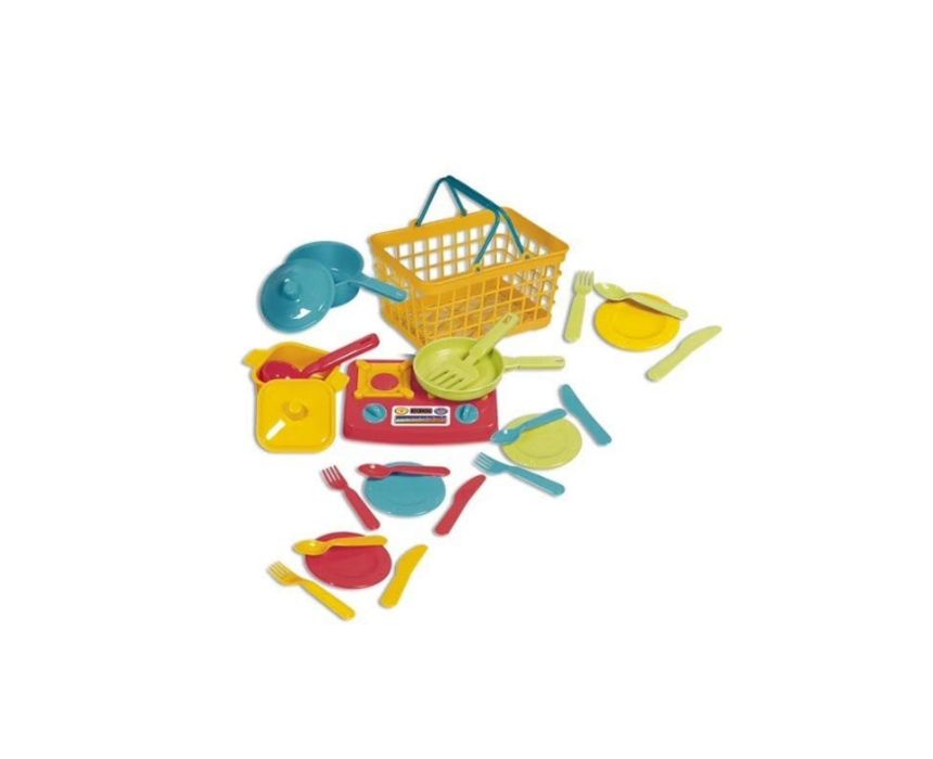 A chef at home! This playset includes 25 kitchen accessories, such as a hob, plates, pots, and kitchen utensils, all neatly stored in a portable basket. Your child can enjoy cooking like a chef while developing manual dexterity and imagination. The Funny Home play kitchen offers endless fun and creativity, helping kids role-play real-life cooking experiences. After playtime, everything can be stored conveniently in the basket for easy transport and tidy storage Designed for kids aged 3+
