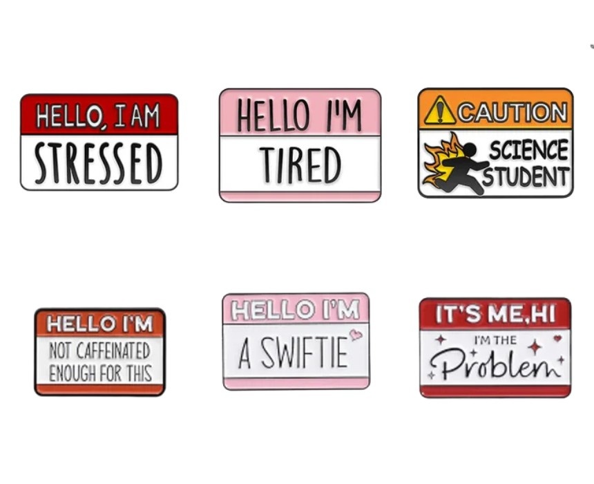 These enamel pins feature humorous sign inspired designs with a smooth polished finish and secure backing for reliable everyday wear. Crafted for durability and vibrant long lasting color, they are perfect for styling on jackets, backpacks, hats, or lanyards. Lightweight and versatile, they add a playful and expressive touch to casual outfits.