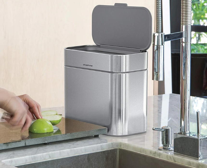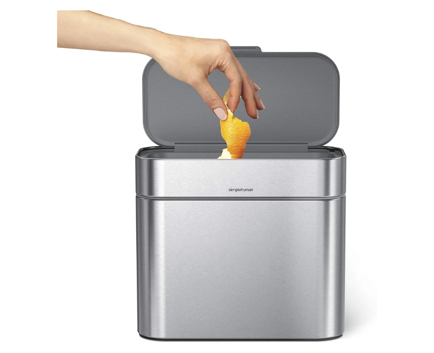 The simplehuman Compost Caddy in 4L 1.06 gallon capacity is crafted from brushed stainless steel for a durable, odor-resistant solution to kitchen composting. Its compact design fits conveniently on countertops or under sinks, and it is best styled as an eco-friendly addition to modern or minimalist kitchens.