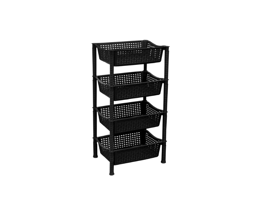 The Gamma Rattan Vegetables Rack with 4 shelves in black offers sturdy and stylish storage for organizing vegetables, fruits, and kitchen essentials. Its rattan textured finish and multi tier design make it both decorative and practical, while the durable build ensures reliable everyday use. Ideal for kitchens, pantries, or utility spaces where easy access and neat organization are needed.