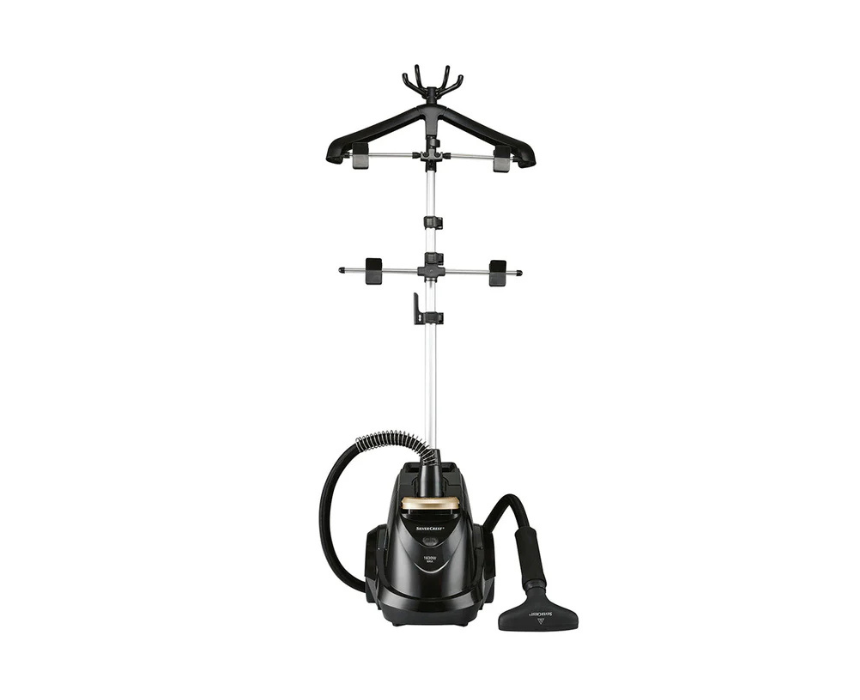 This clothes steamer provides fast and effective de-wrinkling and freshening for garments, with high-temperature steam that kills bacteria. It features a 2.5-liter refillable water tank, telescopic suspension rod, clothes hanger with clips, and large smooth-running wheels for mobility. Ready in 60 seconds and including accessories like a steam brush, fabric brush, wrinkle holder, protective glove, and storage bag, it’s ideal for home or professional use.