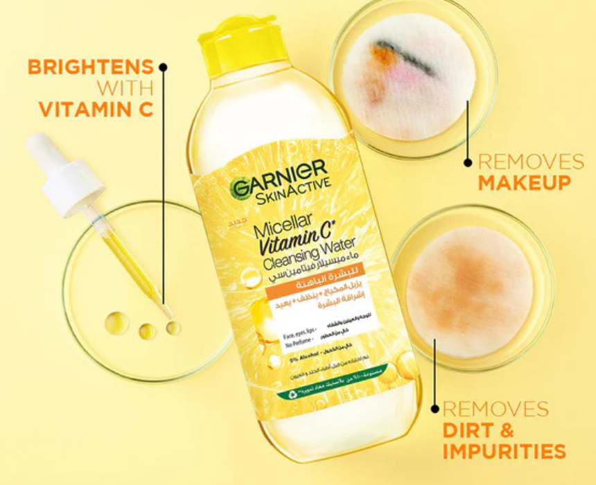 Garnier Micellar Brightening Cleansing Water with Vitamin C is an all in one facial cleanser and makeup remover that gently removes impurities, oil, and makeup without harsh rubbing. Its micellar technology works like a magnet to lift away dirt while helping brighten the skin for a fresh and clean appearance. Suitable for all skin types, it is applied with a cotton pad on the face, eyes, and lips as part of a daily skincare routine without the need for rinsing.