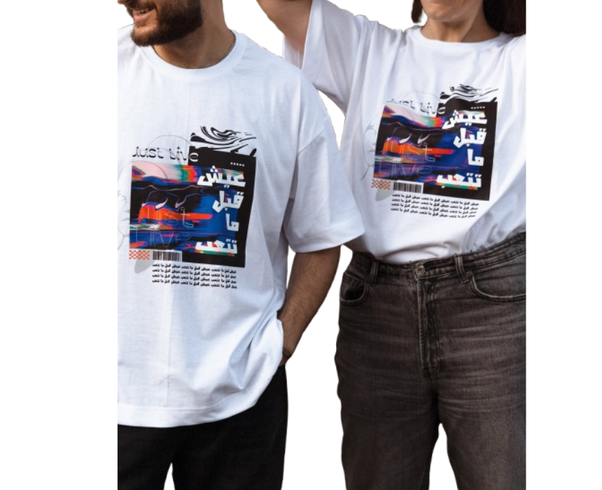 The Genderless Just Live T-Shirt is an oversized poly-cotton design crafted in Lebanon and features the Bel Aarabiye statement “عيش قبل ما تتعب” paired with “Just Live,” made for those who love to dance, rave, and enjoy every moment. Its soft 40–60% poly-cotton fabric provides a comfortable everyday fit that pairs effortlessly with jeans, shorts, or casual layers. A perfect meaningful gift that captures energy, joy, and spontaneity.