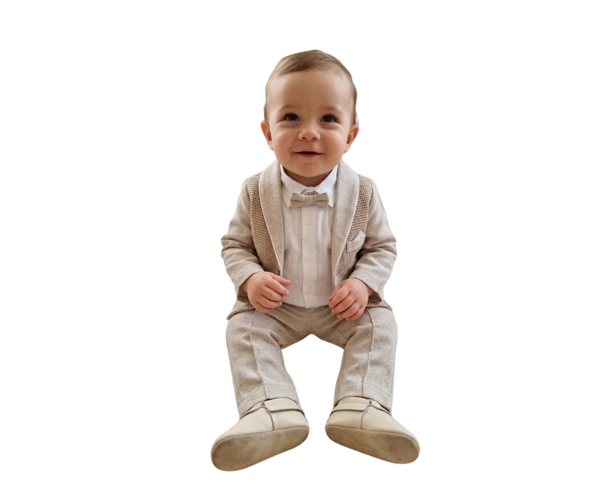 This gentlemen suit set is designed for babies and toddlers aged 9 months to 3 years, offering a polished and charming look for special occasions. Made with comfortable, soft materials, it ensures ease of movement while maintaining a refined style. Pair it with dress shoes or loafers for a complete outfit perfect for celebrations, events, or family gatherings.