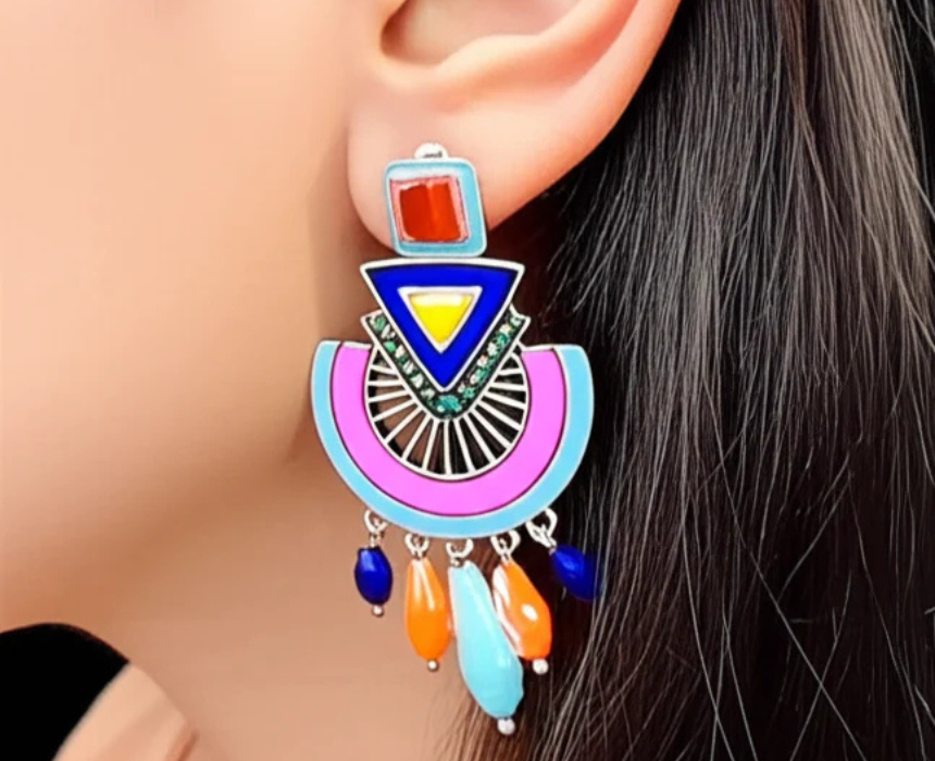 Geometric Multi Color Enamel Earrings showcase a bold geometric design accented with vibrant multicolor enamel for a modern artistic finish. Lightweight and comfortable for all day wear, they bring a playful yet polished touch to any look. Ideal for styling with neutral outfits or adding color to casual and evening ensembles.