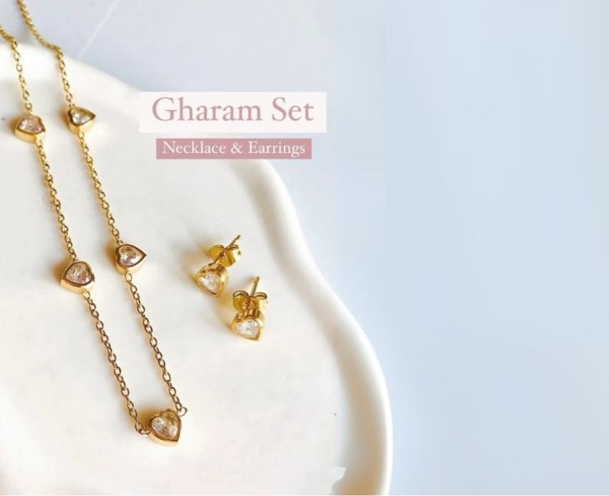 The Gharam Set features a matching necklace and earrings crafted from shiny, durable stainless steel with elegant heart shapes that add a romantic touch. This charming duo is perfect for everyday wear or special occasions and pairs beautifully with both casual and dressy looks. Layer the necklace with delicate chains or wear it solo for a timeless statement.