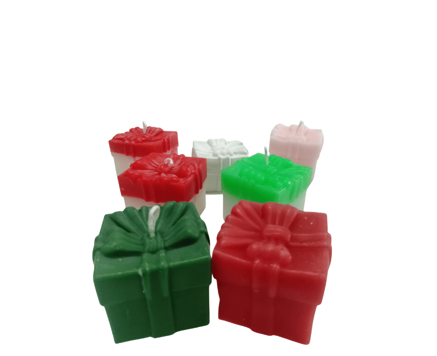 Natural beeswax candle shaped like a gift box. Handmade and available in red, green, and white. Colors can be customized upon customer request. Perfect for festive décor or as a thoughtful gift.