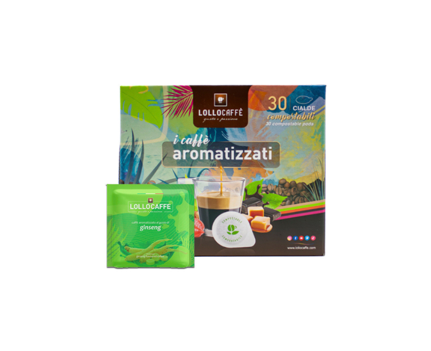 Ginseng Coffee Espresso Pods (Box of 30) combine 7.5g of roasted coffee and ginseng for a robust, invigorating espresso. Made in Italy, these pods offer the energizing, bold notes of ginseng paired with the classic Lollo blend, providing a refreshing coffee experience. Enjoy it as a strong espresso for a quick energy boost or add milk for a revitalizing ginseng latte.