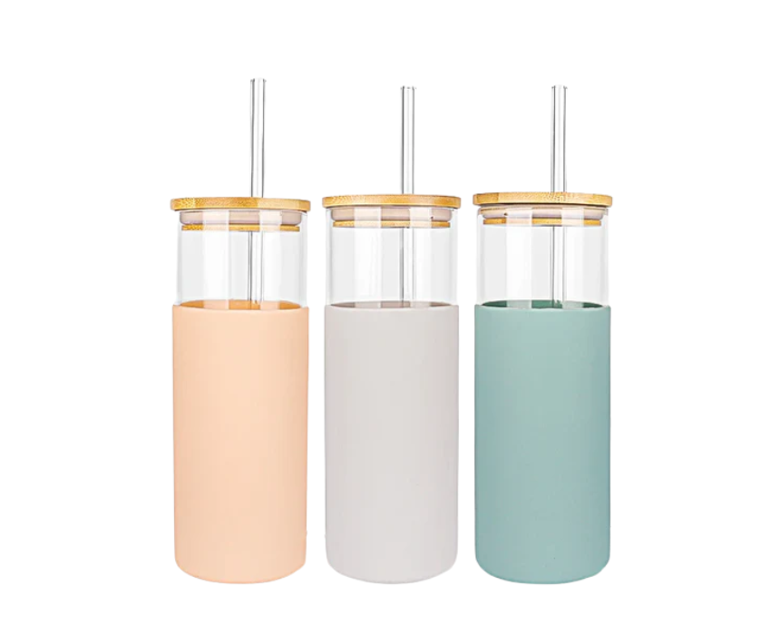 The Glass Cup with Sleeve is a 500ml borosilicate glass tumbler designed for everyday use, featuring a soft silicone sleeve for comfort and protection. It includes two reusable straws—one stainless steel and one glass—and a bamboo lid with a spill-resistant silicone seal. Perfect for iced coffee, smoothies, juices, or water, it’s stylish, eco-friendly, and easy to carry wherever you go.