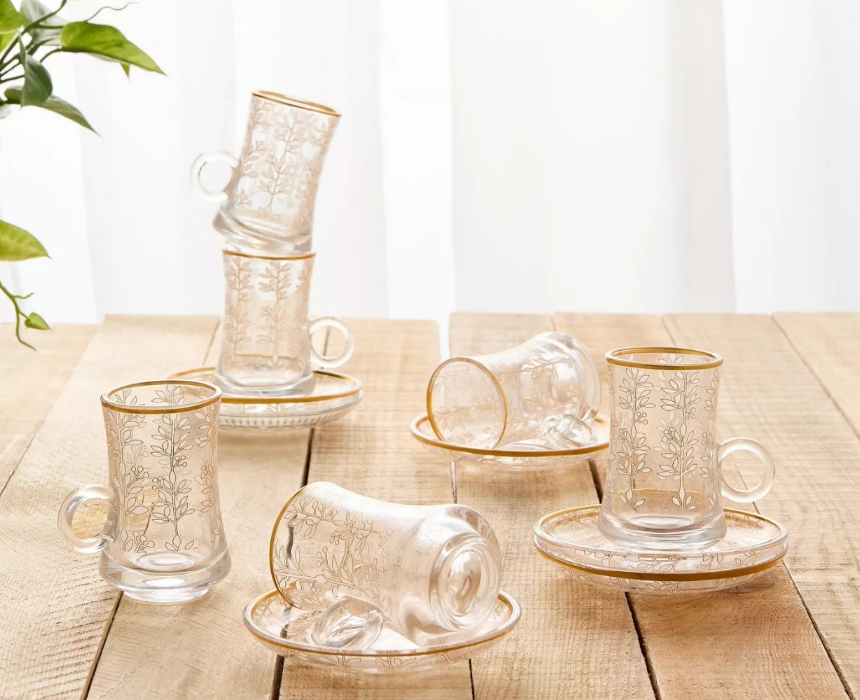 This 120 ml istikan set is crafted from high quality glass and features a beautiful all over leaf motif for an elegant touch. Each piece includes a comfortable handle making it ideal for enjoying hot or cold beverages in style. Perfect for entertaining guests or relaxing at home it adds sophistication and charm to any dining experience.