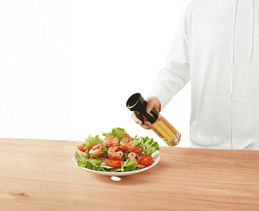 Compact 6×20 cm glass oil spray bottle in black, perfect for evenly spraying oils on salads, pans, or grilling. Stylish, reusable, and easy to handle.