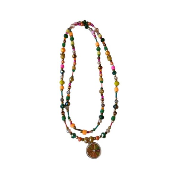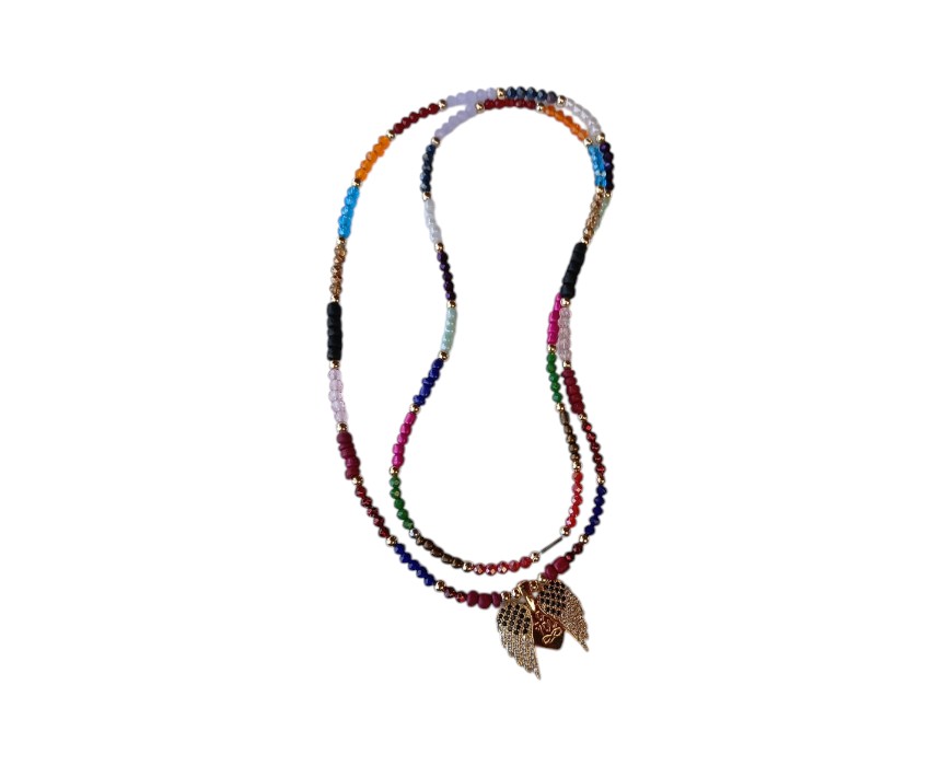 The “F. Heart” is a long handmade necklace featuring a delicate mix of different colored small crystals and shimmering golden separators. The focal point is a beautiful heart-shaped golden pendant that adds a touch of classic romance to the piece. Its fine, detailed design makes it a versatile choice for layering or wearing as a dainty standalone piece. This affordable artisan necklace is a perfect gift for someone special, crafted to maintain its shine.
