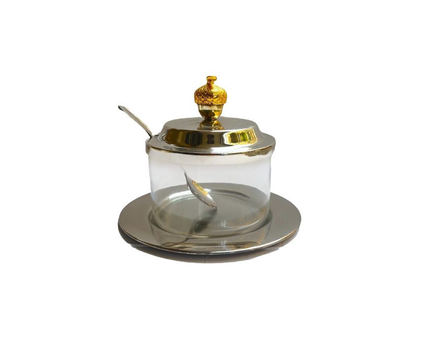 Add elegance to your table with this Italian Silver ARG 925 Jam Jar, featuring a stunning gold-plated acorn on the lid and a matching spoon. Measuring 15 cm in diameter and 10 cm in height, this versatile jar is perfect for serving jam, honey, custard, meghle, or other desserts. Its timeless design pairs beautifully with fine dinnerware, making it ideal for both everyday use and special occasions.