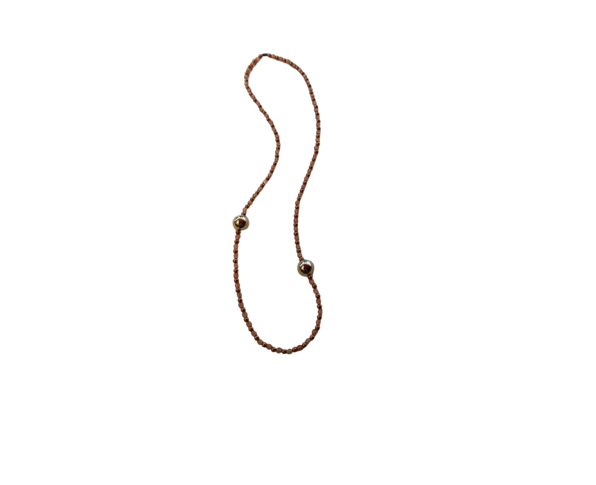 Medium necklace featuring small brown crystals, small brown pearls, and two shiny golden balls. A chic and elegant piece perfect for adding a touch of sophistication to any outfit.