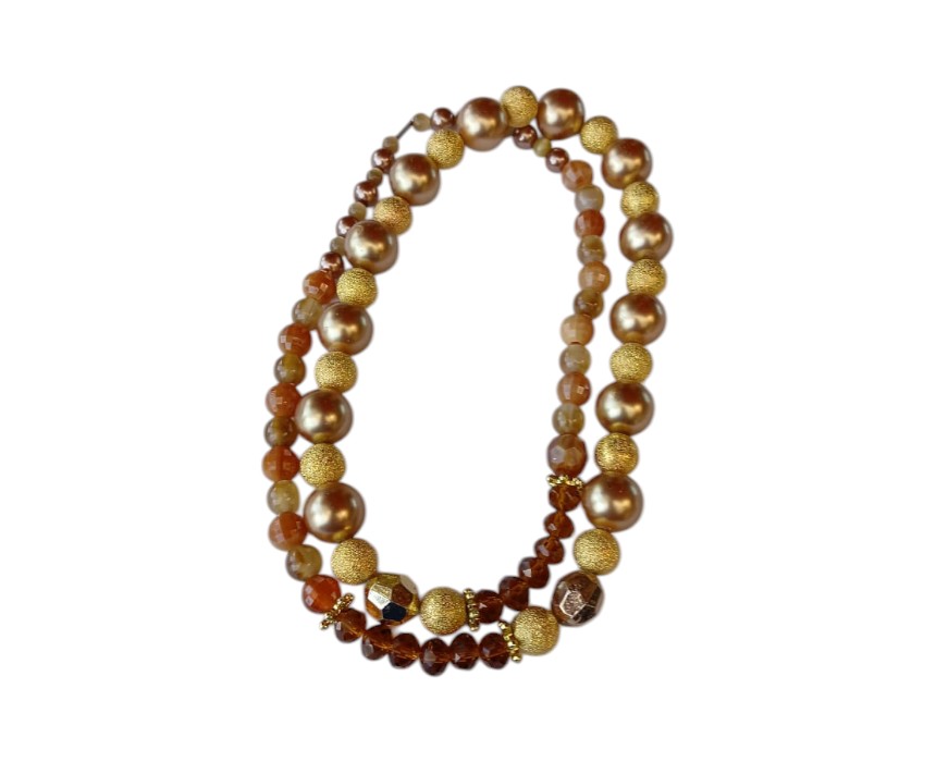 Experience luxury with this long handmade necklace featuring golden and brown crystals, colored beads, and elegant pearls. The design is highlighted by awesome golden balls that add volume and shine to the piece. This rich, warm-toned necklace is a standout accessory for special occasions or when you want to elevate a simple dress. The combination of pearls and crystals creates a sophisticated texture that reflects the light beautifully. Artisan-made.