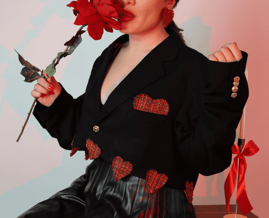 Golden Heart Cropped Blazer is a playful yet elegant statement from the Valentine Collection. This upcycled black blazer is reimagined into a cropped silhouette, adorned with heart-shaped wool details and a bold heart accent on the front pocket. Finished with unique vintage golden buttons—each one different—it blends charm, creativity, and timeless style.