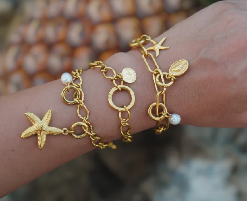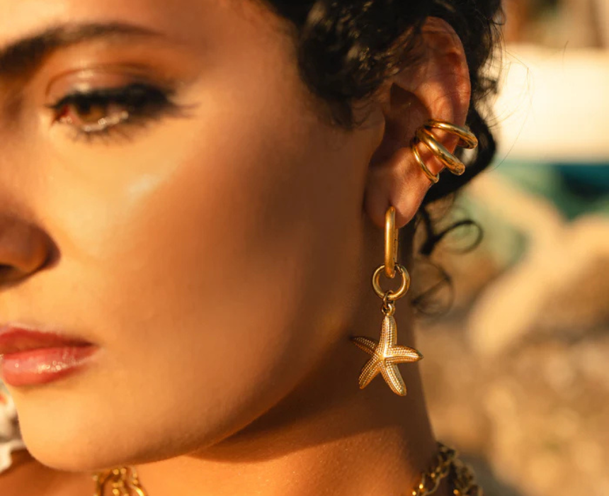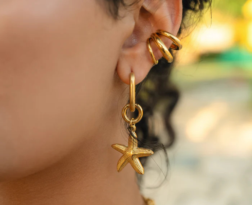 Golden Starfish Charm features a refined ocean inspired design with a radiant finish that adds a warm coastal accent to any jewelry piece. Lightweight and versatile, it can be styled on necklaces or bracelets for everyday wear or layered looks. Wear it alone for a subtle statement or pair with other charms to create a personalized beach inspired style.