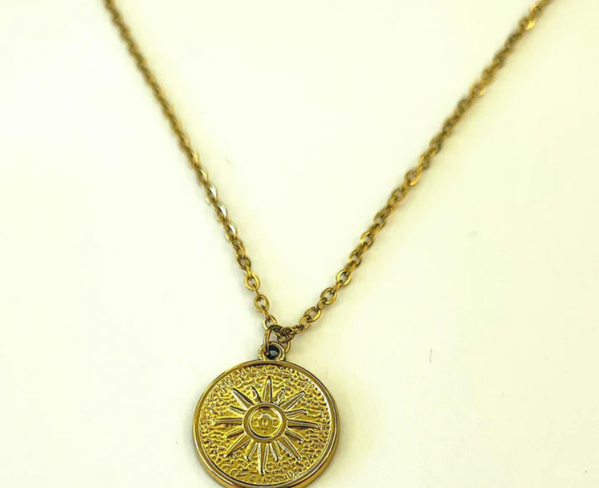 The Golden Sun Necklace is made from 18K Gold Plated Stainless Steel and features a radiant sun pendant, perfect for adding a warm and elegant touch to any outfit, can be layered with other necklaces or worn alone as a statement piece, ideal for casual or formal occasions.