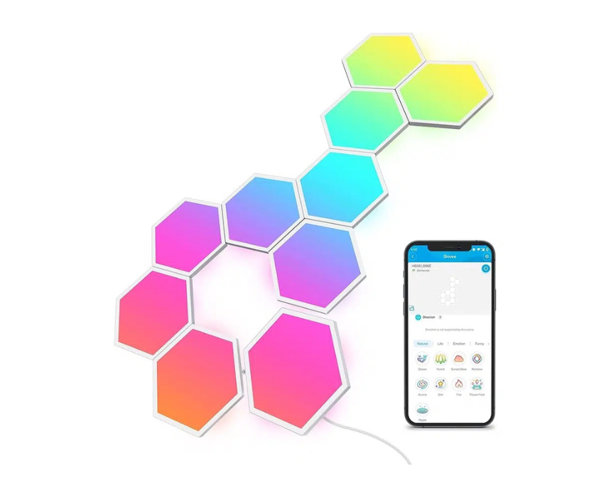 The Govee Glide Hexa Light Panels offer customizable modular lighting with vibrant colors and dynamic effects controlled through the Govee app. Designed to enhance bedrooms, gaming setups, or creative spaces, they allow flexible arrangement to create personalized wall art. Mount them in any pattern to add immersive lighting and a modern decorative touch to your room.