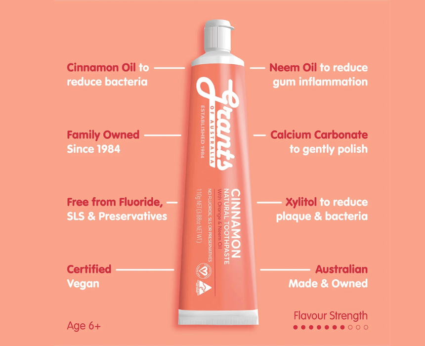 Grants Cinnamon Natural Toothpaste is a gentle, non-mint option for everyday oral care. Made with warming cinnamon and a hint of orange, it is boosted with Neem Oil to help support healthy gums and fresh breath. This fluoride-free, natural formula is ideal for those who prefer an alternative to mint while still enjoying effective and refreshing oral hygiene.
